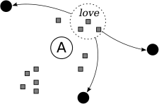 Figure 4: In this example, the keyword "love" is closest to node A and is generating a high degree of load. Node A creates a virtual node centered around the keyword love, which includes its leaf set and all objects in the region within p edit-distance from love. This virtual node is sent to A's nearest neighbors. Queries that arrive at these neighbors for keywords within an edit-distance p of love can be answered without node A.
