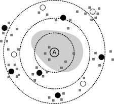 Figure 2: In this example, the solid circles represent peers in node A's peer-set, the empty circles represent other peers, and the squares represent object keywords in the system. The shaded region depicts the sub-space that is closer to A than any other node.