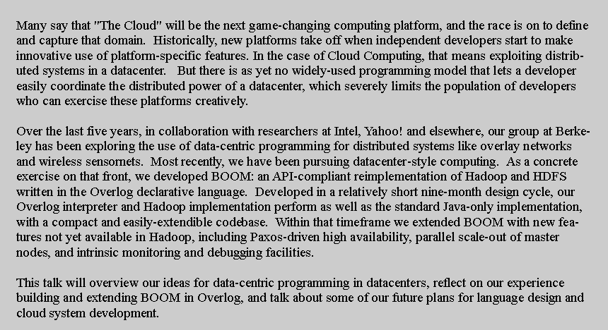 Joseph M. Hellerstein Professor, EECS Computer Science Division UC BERKELEY Joseph M. Hellerstein is a Professor of Computer Science at the University of California, Berkeley, whose research focuses on data management and distributed systems. His work has been recognized via awards including an Alfred P. Sloan Research Fellowship, MIT Technology Review's inaugural TR100 list, and two ACM-SIGMOD "Test of Time" awards. Key ideas from his research have been incorporated into commercial and open-source database software released by IBM, Oracle, and PostgreSQL. He has also held industrial posts including Director of Intel Research Berkeley and Chief Scientist of Cohera Corporation, and currently serves as an advisor to a number of technology companies. |