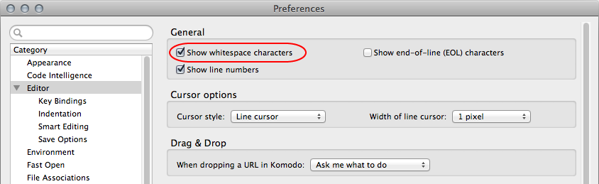 it cannot find the file Troubleshooting pre-Mavericks OS XIf your installation is not working and you are using OS X 10.6, 10.7, or 10.8, there is one more thing you should try before posting to Piazza. Remember that you now have two versions of Python and we need to make sure that you are running the correct one. The "application path" is how the Terminal finds the correct version of Python to use. Launch the Terminal and enter the command which python This command asks the Terminal "which version of Python are you using?" If you get the answer /usr/local/bin/python then you have the correct version of Python. In that case, your installation problem must be somewhere else. However, if you get the answer /usr/bin/python this is the Apple Python, which is a problem (if you are not on OS X Mavericks). If you are absolutely certain that you followed all of the steps above, it is time to see a consultant, as this is not a problem that is easy to fix over Piazza. Installing Komodo EditThe last program to install is Komodo Edit. Unlike Python, you will not use this program right away; we will not start to use it until the third week of class. The purpose of Komodo Edit is to make these mysterious modules that you tested in the previous step. Technically, you can write Python modules in any text editor (e.g. a Word processor that only produces text and does not have fonts or fancy formatting). NotePad and WordPad are text editors in Windows, while TextEdit is provided by OS X. The reason we use Komodo Edit is that it is the same across all platforms. That allows you to collaborate with partners who might be working on other operating systems. To install Komodo Edit, first download the installer from Active State's website (click on the blue "Download Komodo Edit" button after you follow that link). Do not download Komodo IDE, as that is the paid version. Again, you will be redirected to a website asking for some personal information; ignore that and wait for the download to finish. The file that you download will either be a MSI installer for Windows or a DMG for Macintosh. Double click on it and follow directions. Configuring PreferencesOne of the most controversial aspects of Python is that it treats spaces and tabs very differently. If you accidentally put a tab in your program, it will cause your program will crash. And you will have a hard time finding it because both tabs and spaces look exactly the same. To solve this problem, you need to change your preferences to help you distinguish between the two. Open Komodo Edit and then select the Preferences menu option (under Edit on Windows; under Komodo on Macintosh). Choose the Editor category and check the box Show whitespace characters, as shown below.
