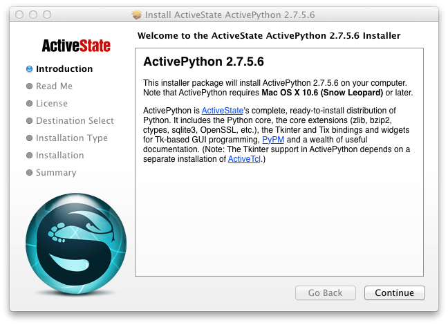 Double-click on the file that is named Once you have finished with the Cornell Extensions, you should test your installation. Installing on Mac OS XPlease note that these instructions are a bit different depending on which version of the OS you are running. Make sure you know your version and pay attention to where the instructions are different. Snow Leopard (10.6), Lion (10.7), and Mountain Lion (10.8) will use ActiveState Python, like on Windows, but Mavericks (10.9) will use the Python that comes with the OS. The Python libraries in this class require a 64 bit OS. That means it is only compatible with Snow Leopard (10.6) and later (the current version of OS X is Mavericks, 10.9). If you are still using an older version of OS X (such as Leopard, 10.5), the installation process will fail. In that case, you will either need to upgrade your OS or work in the ACCEL lab. Installing on a Macintosh is a bit trickier than Windows, primarily because OS X already comes with Python by default. We do not want to use the Apple version of Python on versions of the OS before 10.9, but we do not want to delete it either (deleting System software is always a bad idea). Therefore, you need to be extra careful in to test your installation and make sure you are not using Apple Python on one of these older versions. Mac OS 10.6, 10.7, or 10.8 only: Install ActiveState Python