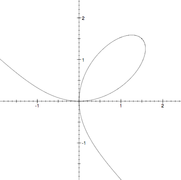 Your plotter will attempt to find the points in a region that satisfy a given equation. The trick is to interpret the equation as a function of x and y which has zeros at the places that the equation is true. For example, the equation above is true wherever the function f(x,y) = x3 + y3 - 3xy is equal to zero. Fortunately, you just implemented interval arithmetic in PS3, which is useful for efficiently finding function zeros. Of course, you'll want to be sure to fix any bugs that you had in PS3, because otherwise there will be bugs in PS4.