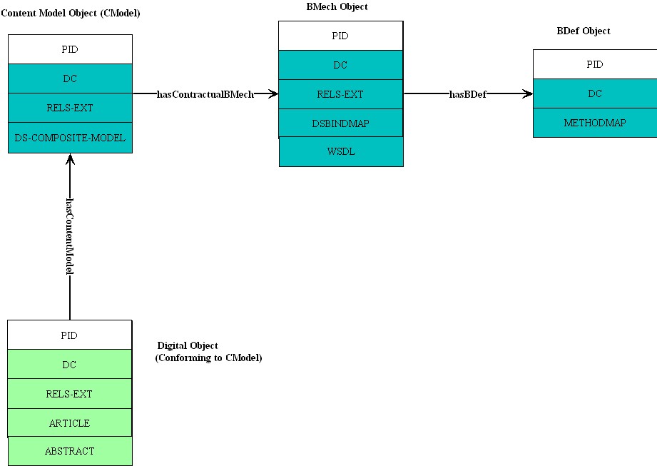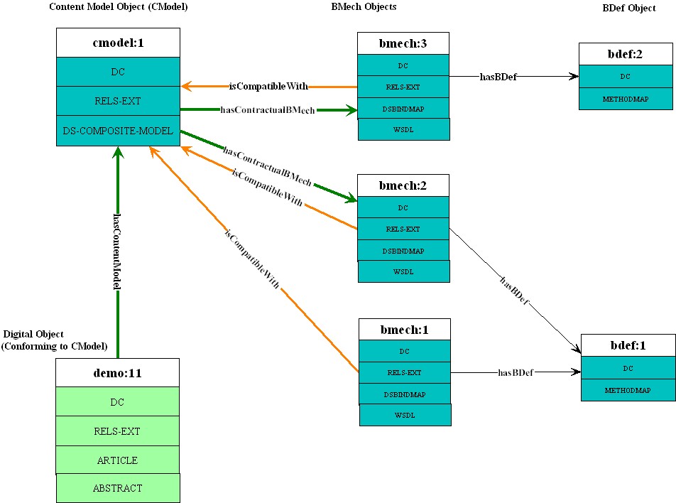 In the proposed CMDA, regular digital objects in a repository can have a relationship to one or more CModel objects (assume conformance is validated). CModel objects, in turn, have relationships to one or more BMech objects (which store service description and service binding metadata that are the building blocks for a set of run-time behaviors for "conforming" digital objects. As always, a BMech object is related to a BDef object (a BDef defines a set of methods in the abstract; a BMech contains WSDL bindings to a concrete service that runs the abstract behaviors).