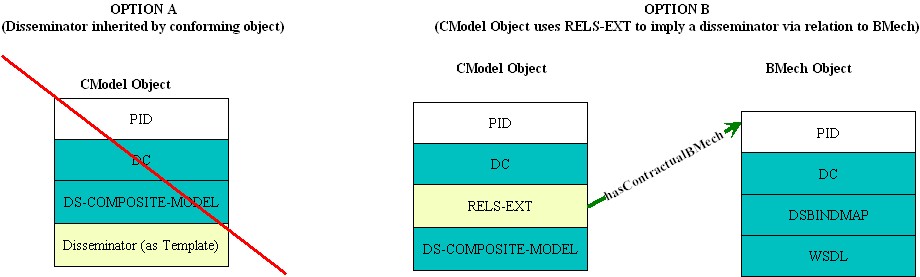 As of Fedora 2.1, digital objects can have one or more disseminators attached to them. Each disseminator is pre-bound to an individual digital object (and stored as a component of the object in FOXML). It has been observed that modification of pre-bound disseminators is awkward. If a change to a disseminator must occur, each object must be individually modified if a disseminator is to be modified. Also, the current release of Fedora does not allow modification of BMech and BDef objects that lie behind disseminators. This means that (1) you can't add a new method to a BDef/BMech, (2) you can't modify existing method definitions, and (3) you can't modify BMech binding maps. The current reasons restriction are: (1) details related the current implementation of the "replication" module that keeps the dissemination database tables up to date, and (2) over optimization of the dissemination database tables.
