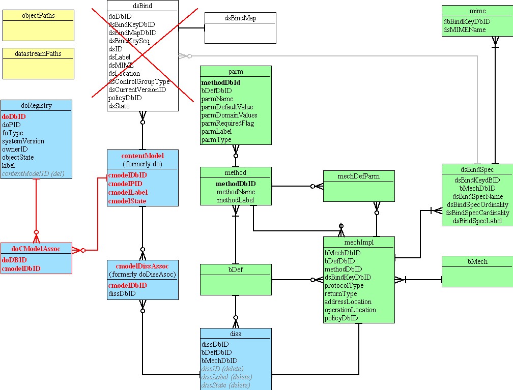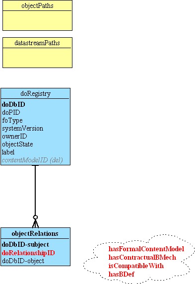 However, if we pursue the new content model dissemination architecture proposed in this document, we may be able to work around the existing problems (any possibly obsolete the existing dissemination database). Below are links to diagrams of the existing database schema, and two possible new ones: