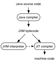 Source code is compiled to JVM bytecode. This bytecode can immediately be interpreted by the JVM interpreter. The interpreter also monitors how much each piece of bytecode is executed (run-time profiling) and hands off frequently executed code (the hot spots) to the just-in-time (JIT) compiler. The JIT compiler converts the bytecode into corresponding machine code to be used instead. Because the JIT knows what code is frequently executed, and which classes are actually loaded into the current JVM, it can optimize code in ways that an ordinary offline compiler could not. It generates reasonably good code even though it does not include some (expensive) optimizations and even though the Java compiler generates bytecode in a straightforward way.