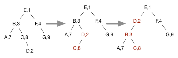 For example, adding a node D with priority 2 to the treap above results in the following rotations being done to restore the heap invariant: