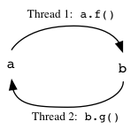 For example, suppose we have a < b in the lock ordering, and a lock level annotation to the methods f() and g() that says the highest level that can be held is the corresponding lock. The call to a.f() in B.g() violates the lock ordering, so we can see that it might result in deadlock.