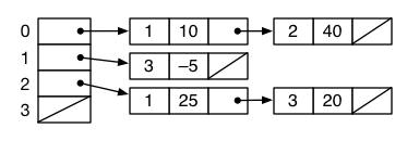 Since sparse graphs are quite common, the adjacency list representation is often preferred. This representation keeps track of the outgoing edges from each vertex, typically as a linked list. For example, the graph above might be represented with the following data structure:
