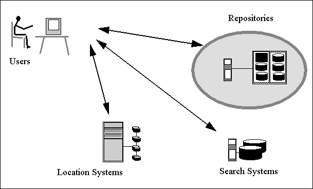 The figure shows two typical services which are provided by digital libraries: location systems and search systems. Search systems provide catalogs, indexes, and other services to help users find information. Location systems are used to identify and locate information.