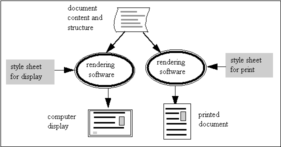 Since digital texts and printed materials serve different roles, publishers create printed and online versions of the same materials. Figure 9.2 shows how a mark-up language can be used to manage texts that will be both printed and displayed on computer screens. By using separate style sheets, a single document, represented by structural mark-up, can be rendered in different ways for different purpose. Thus, journal articles can be displayed on screen or printed. The layout and graphic design might be different, but they are both derived from the same source and present the same content.