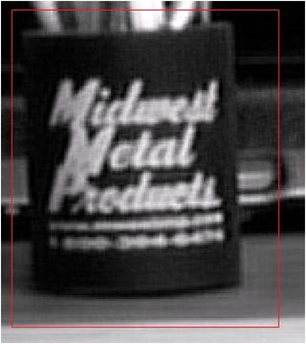 Figure 2: Applying the reconstruction algorithm on a stream of low resolution images of the mug leads to a higher resolution image. The writing on the mug is now intelligible and reads "Midwest Metal Products".