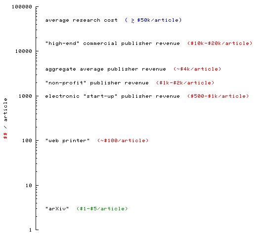 The next figure on the scale is a rough estimate of the revenues for "high end" commercial journals. (In this case "high end" refers to the pricing, rather than to any additional services provided.) The $10,000--$20,000/article published range is obtained by multiplying the subscription cost per year for some representative "high end" journals by an estimated number of institutional library subscribers and dividing by the number of articles published per year.