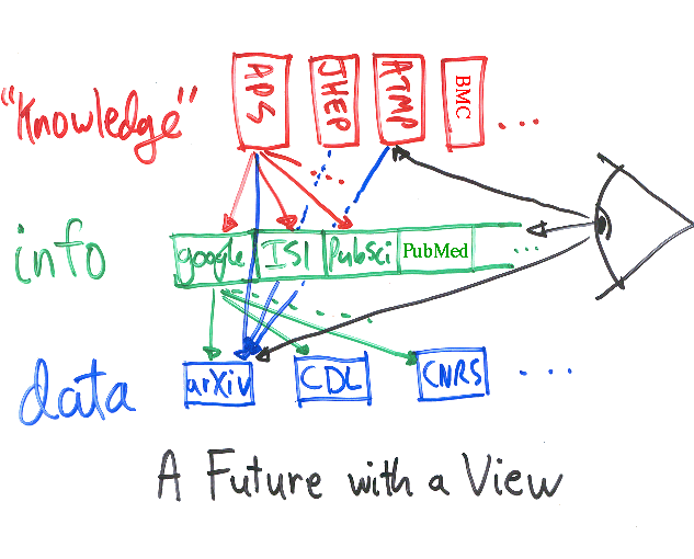 The three layers depicted are multiply interconnected. The green arrows indicate that the information layer can harvest and index metadata from the data layer to generate an aggregation which can in turn span more than one particular archive or discipline. The red arrows suggest that the knowledge layer points to useful resources in the information layer. As mentioned above, the knowledge layer in principle provides much more information than that contained in just the author-provided "data": e.g. retrospective commentaries, etc. The blue arrows -- critical here -- represent how journals of the future can exist in an "overlay" form, i.e. as a set of pointers to selected entries at the data level. Abstracted, that is the current primary role of journals: to select and certify specific subsets of the literature for the benefit of the reader. A heterodox point that arises in this model is that a given article at the data level can be pointed to by multiple such virtual journals, insofar as they're trying to provide a useful guide to the reader. (Such multiple appearance would no longer waste space on library shelves, nor be viewed as dishonest.) This could tend to reduce the overall article flux and any tendency on the part of authors towards "least publishable units". The future author could thereby be promoted on the basis of quality rather than quantity: instead of 25 articles on a given subject, the author can point to a single critical article that "appears" in 25 different journals.