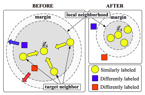 Large Margin Nearest Neighbor Classifiction is a NIPS05 paper in which we show how to learn a Mahanalobis distance metric for k-nearest neighbor (kNN) classification by semidefinite programming. The metric is trained with the goal that the k-nearest neighbors always belong to the same class while examples from different classes are separated by a large margin. On seven data sets of varying size and difficulty, we find that metrics trained in this way lead to significant improvements in kNN classification---for example, achieving a test error rate of 1.3% on the MNIST handwritten digits. Our approach has many parallels to support vector machines, including a convex objective function based on the hinge loss, but does not require modifications for problems with large numbers of classes.