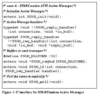 The C header file for the interface to SSAM is shown in Figure 1. To send a request Active Message, the user places the message data into a per-connection buffer provided by SSAM and calls SSAM_10 with a connection identifier and the remote handler address. SSAM_10 adds the flow-control information and traps to the kernel to have the message injected into the network. It also polls the receiver and processes incoming messages. At the receiving end, the network is polled by SSAM_10 or SSAM_poll (the latter only polls the network) and all messages accumulated in the receive FIFO are moved into a buffer. SSAM then calls the appropriate handler for each message, passing as arguments the originating connection identifier, the address of the buffer holding the message, and the address of a buffer for a reply message. The handler processes the message and may send a reply message back by placing the data in the buffer provided and returning the address of the reply handler (or NULL if no reply is to be sent).