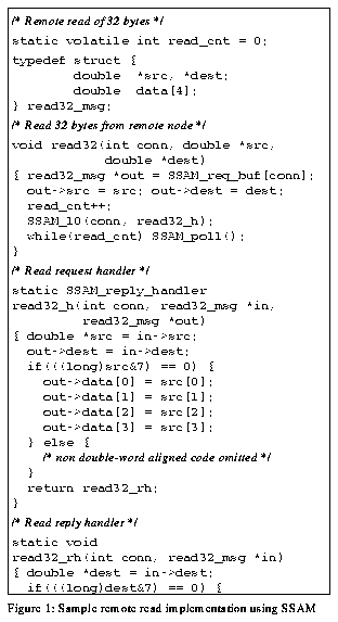 The advantage of SSAM over the remote memory accesses is the coupling of data and control: each message causes a small amount of user code to be executed, which allows data to be scattered into complex data structures and the scheduling of computation to be directly influenced by the arrival of data. In the remote memory access model a limited control transfer is offered through per-segment notification flags in order to to cause a file descriptor to become ready.