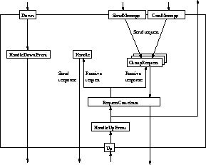 Methods SendMessage and CastMessage provide synchronous group messages (discussed below): they make use of GroupRequests and a RequestCorrelator (see 3.4.4 and 3.4.3) to do so. Any time one of the two methods is called, a new group request will be created and registered with the request correlator. The group request object then uses RequestCorrelator.SendRequest to send a message. The request correlator will assign a unique request number to the request, add a header to is so that it will be received by the correct peer layer in the receiver's protocol stack, and passes it down the stack.