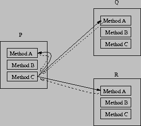 In the example, the group of peer protocols would consist of the 3 members P, Q and R. Each is a protocol layer in a different protocol stack (e.g. on a different machine). P now wants to call method A of all members in the group and collect the responses. It does so by invoking one of the CallRemoteMethods methods of RpcProtocol (discussed below). A MethodCall object (see 3.4.2) will be constructed, inserted in the buffer of a message and sent to all peers. Each peer receives the message, extracts the method call object, invokes it against itself and returns a result in the form of an object (or null, if the method has a void return value). The results will be received by the calling method as a response list.