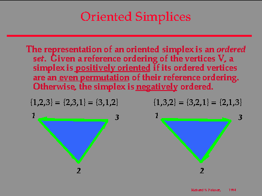 The representation of an oriented simplex is an ordered set. Given a reference ordering of the vertices V, a simplex is positively oriented if its ordered vertices are an even permutation of their reference ordering. Otherwise, the simplex is negatively ordered.