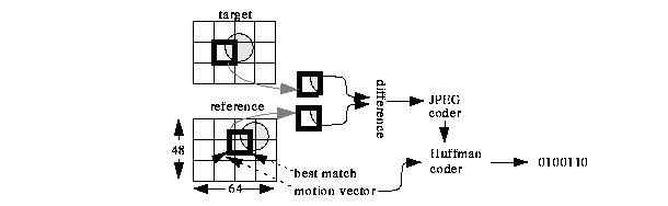 B-frames and P-frames are encoded as a difference from nearby I- or P-frames (called reference frames). P-frame encoding is shown in figure 5. MPEG partitions a P-frame into 16x16 pixel macroblocks. Each macroblock in the P-frame, called the target macroblock, is encoded by searching for a macroblock in the reference frame (the most recent I- or P-frame), typically using the mean squared error or mean absolute error as a metric. The difference in coordinates between the target macroblock and its best match is called the motion vector, and their pixel-wise difference is called the error term. The error term is compressed using JPEG and stored along with the motion vector in the MPEG bitstream. B-frame compression is nearly identical to P-frame compression, except that two reference frames (one from the earlier in the sequence and one from later) can be used. This extra degree of freedom can result in very high compression ratios, as high as 500 to 1.