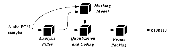 Masking is a psychoacoustic effect where larger amplitude signals obscures lower amplitude signals. Studies have shown that masking decreases with distance in the frequency domain. This fact means that, in MPEG audio, an amplitude coefficient with a large value will tend to render a neighboring coefficient with a small value inaudible. MPEG uses this fact to represent the smaller, neighboring coefficient with fewer bits than its large neighbor. The exact number of bits assigned to each coefficient is determined by a psychoacoustic model. The model also computes a scaling factor for each band, which is essentially an exponent which is used to expand the quantized sample to the necessary range. The quantized sample, bit allocations, and scaling factors comprise the resulting bitstream. The MPEG audio compression process is illustrated in figure 7.