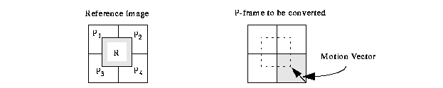 Chang's solution to this problem is to convert P- and B- frames into I-frames, then process the resulting frames using strategies similar to those of JPEG frames [4, 5]. Converting a P-or B-frame into an I-frame requires computing DCT coefficients of a motion compensated macroblock from the motion vector and the coefficients in the reference frame. Chang showed how to compute these coefficients by pre-multiplying and post-multiplying the reference macroblocks with appropriate matrices. Suppose in figure 6, R is the macroblock in the reference frame that we wish to derive from the four original macroblocks P1... P4. In the spatial domain, this conversion is expressed by the following equation: