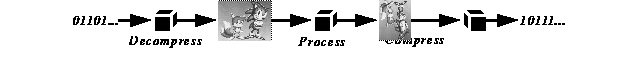 We now turn to the problem of processing JPEG data. A naive approach would decompress the data, process it, and compress the result, as shown in figure 2. This strategy is called spatial domain processing. The basic idea of compressed domain processing is to convert the spatial domain process into its frequency domain equivalent. This conversion is accomplished by representing the spatial domain process and the transforms used in compression a linear operators, and form the composite operator. Compressed data is then processed by entropy decoding the bitstream to recover the sparse vector data, applying the compressed domain operator, and quantizing and compressing the result. Figure 3 shows this strategy.
