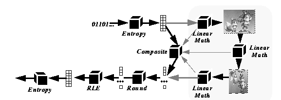 Perhaps the simplest type of video processing that has been mapped into the compressed domain (for JPEG) is pixel arithmetic [13]. This type of processing consists of four operations: scalar addition (add a constant to each pixel in an image), scalar multiplication (multiply each pixel in an image by a constant), pixel-wise addition (add the pixels in two images), and pixel-wise multiplication (multiply the pixels in two images). These operations can be implemented directly on the run-length coded, quantized vectors (the RLE vectors), which can be obtained by Huffman decoding the JPEG bitstream. It can be shown that scalar addition is equivalent to altering the DC component of each block (the first element in the RLE vector), scalar multiplication is equivalent to multiplying each element of the RLE vector by a constant, and pixel-wise addition is equivalent to adding two RLE vectors. Pixel-wise multiplication is more complex: it involves the multiplication all possible pairs in the two RLE vectors. Since the vectors are relatively sparse, this operation is not too expensive in the average case.