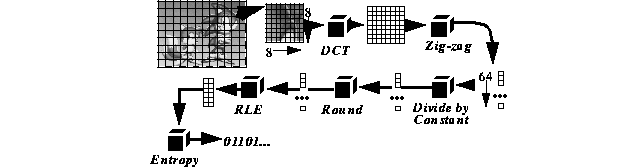JPEG is a standard for still image compression [10] that can achieve compression ratios as high as 50 to 1. When JPEG is applied to each frame in a video sequence, the result is called "motion JPEG" video compression. The baseline JPEG algorithm is outlined in figure 1. Briefly, JPEG converts an RGB image into the YUV color space, subsampling the chrominance (U and V) components. Each component is divided into 8x8 pixel blocks, which are transformed using a discrete cosine transform (DCT). The post-DCT 8x8 block is encoded as a one dimensional, 64 element vector using zig-zag scanning, a heuristic that places the low frequency coefficients, which are located in the upper left corner of the block, early in the vector. The vector is scaled by dividing each coefficient by a constant. The constant varies from element to element, and is proportional to the human eye's sensitivity to an error in each coefficient. The scaled vector has the following property: an error of up to one half can be introduced in each element without a noticeable difference in the reconstructed image. Consequently, the elements of the scaled vector are rounded to the nearest integer, a process called quantization. Experiments reveal that typically 55 to 60 of the 64 quantized elements are zero, so they are encoded using run-length encoding (RLE), and the result is entropy coded using either Huffman or arithmetic coding.