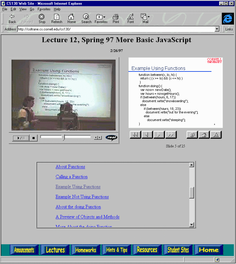 Once the final video is ready, it can be played back through a web browser, and synchronized with high-quality images of the lecture slides (if the images are available), so that as the lecture is viewed, the slide images flip in concert in a separate window on the web page. Conversely, if the user selects a certain slide, the video will be automatically fast-forwarded/rewinded to the point in the lecture where the slide first appeared. The web interface will look something like this: