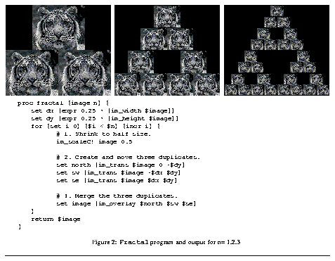 More complex effects can be constructed using Tcl constructs for looping, branching, procedure creation, and recursion. The Rivl program in figure 2 creates a fractal (Sierpinski's Gasket) from an arbitrary image.