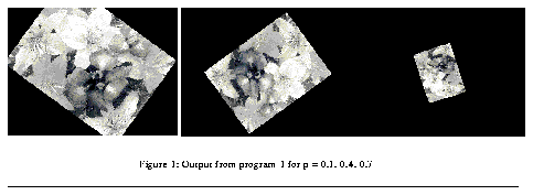 image1 is a Rivl image and p is a floating point value between 0 and 1. The first line calls im_scaleC to shrink image1 about its center by a factor of 1-p and assigns the result to image1. The second line calls im_rotateC to rotate image1 about its center by 360*p and again stores the result in image1. Figure 1 shows the effect of this fragment with several values of p.