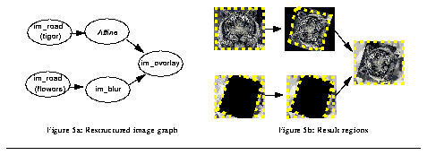 Result-region calculation. The second optimization, introduced by Shantzis[10], is to compute only those regions of each intermediate image that affect the final result. In our example program, only a small portion of flowers is visible in the final result (figure 5b, on right). It is sufficient to read in and blur only this portion.