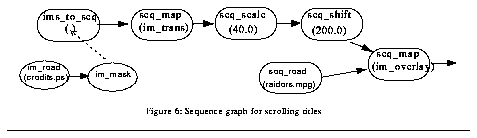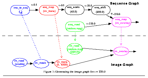 Like image commands, sequence commands are stored in a graph (called the sequence graph) until the sequence is computed (e.g. in response to a seq_write command). Figure 6 shows the sequence graph for program 2, in which each node corresponds with one line of the program. The sequence graph is used to generate a set of image graphs that correspond to the sequence's individual frames.