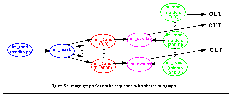 Image subgraph reuse. In figure 8 the subgraph containing im_read(credits.ps) and im_mask is replicated many times. It is more efficient to use a single subgraph with multiple output edges, as shown in figure 9. In this way the pixels of credit.ps are read and masked only once, and the various im_trans nodes share a common input. In general, Rivl detects and merges redundant image subgraphs whenever possible, a form of common subexpression elimination[1].