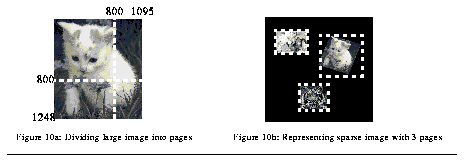 The initial implementation of Rivl treated images as indivisible memory buffers. Unfortunately, this representation performed poorly for large images. The Rivl memory manager divides large images into non-overlapping pages of manageable size (figure 10a). Pages are handled as independent entities by the memory manager, allowing an image to be cached in parts. In addition, large images with considerable blank space are efficiently represented by a set of non-contiguous pages (figure 10b).