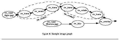 Figure 4 shows the graph created by this program. Both im_scaleC and im_rotateC are implemented with a pair of translations surrounding an im_scale or im_rotate; the translations move the origin of the scale and rotate operations to the center of the image.