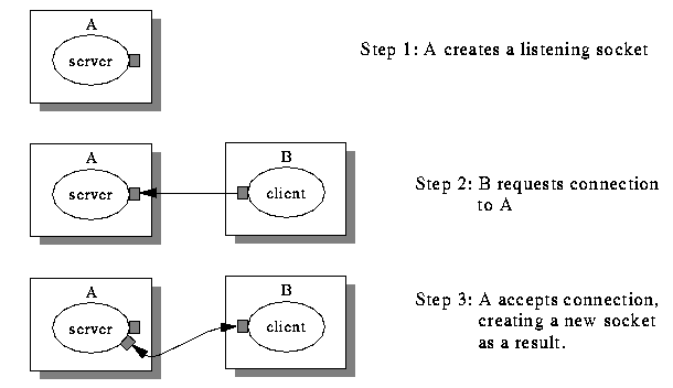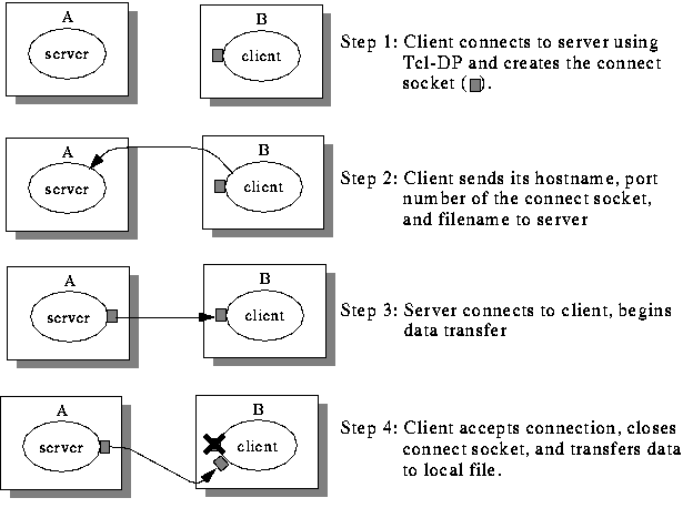 Suppose you wanted to implement a simple FTP style server using Tcl-DP. One way to implement it is to create a new TCP connection for each file transfer, which would be a four step process, as illustrated in figure 10.