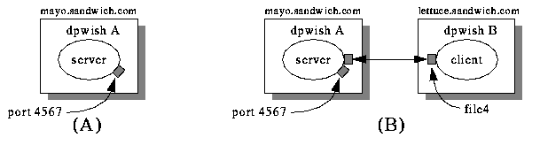 The prompt for A and B should now be "A%" and "B%", respectively. In the examples that follow, the prompt indicates in which dpwish the example commands are to be executed. We will refer to the processes as A and B.