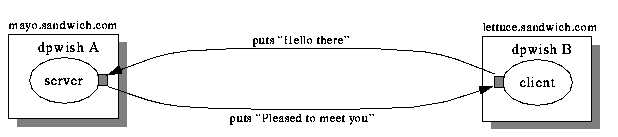 Since Tcl-DP is intended for communicating applications, a second dpwish simplifies the examples. In another window on your machine, start up a second dpwish. We will call the first interpreter "A" and the second "B." To help you distinguish the interpreters, we recommend that you change the prompt of each interpreter. In A, use the following Tcl commands: