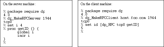 The first command executed on both client and server is the Tcl package command, which makes Tcl-DP library functions and commands available in the current Tcl interpreter. The server executes the dp_MakeRPCServer command, which creates a socket that is waiting for a client to connect. Finally, the server defines the getID command, which generates and returns a unique identifier.