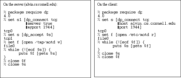 Tcl-DP also contains commands to support basic network communication. Figure 2 shows how to use Tcl-DPs communication facilities to transfer the file /etc/motd from a client machine to the server (alvin.cs.cornell.edu).