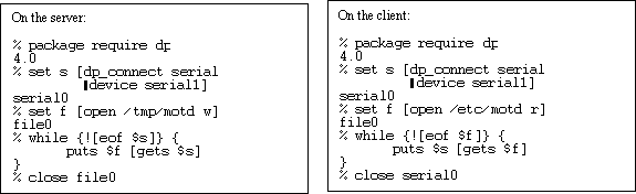 In addition to TCP, UDP and IP multicast, DP 4.0 supports communication via serial ports and email. No matter what its type, a channel is opened using the dp_connect command and supports the same input/output operations. The mechanism allows one channel to be substituted for another in most programs only the channel creation and configuration options (issued through the Tcl fconfigure command) differ. For example, by changing the parameters to dp_connect and deleting the call to dp_accept in Figure 2, we can transfer the file over a serial line instead of a TCP connection, as shown in Figure 3.
