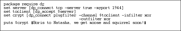 Figure 4 shows how to use a plugin filter. In this example, a server accepts a connection from a client (the first three lines of code), and then attaches an exclusive-or (xor) filter to that channel to weakly encrypt the data. Any data written to the channel is transparently filtered by exclusive-oring it with a key (the key can be changed using the fconfigure command on the plugin channel). To decrypt the data, the user needs another xor plugin filter on the receiving side.