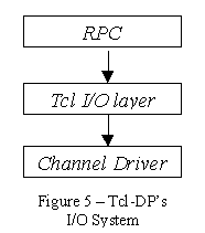 Since version 7.5, Tcl has performed all I/O via Tcl_Channels. Figure 5 shows a block diagram of Tcl-DPs I/O system. The Tcl_Channel abstraction pushes all I/O operations into a channel driver, so that a generic set of operations can be performed on any communications method. For instance, to read data from a channel, one calls the Tcl_Read() function, which will invoke the channel drivers input method to retrieve data available on that channel. DP 4.0 provides drivers for 5 channel types: TCP, UDP, IP multicast, serial ports and email. The dp_RPC and dp_RDO commands sit above the Tcl I/O layer, which allows us to use any channel for RPC communication.
