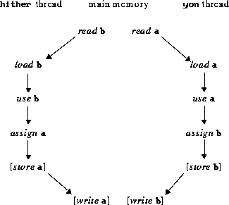 In what order may the actions by the main memory occur? The only constraint is that it is not possible both for the write of a to precede the read of a and for the write of b to precede the read of b, because the causality arrows in the diagram would form a loop so that an action would have to precede itself, which is not allowed. Assuming that the optional store and write actions are to occur, there are three possible orderings in which the main memory might legitimately perform its actions. Let ha and hb be the working copies of a and b for the hither thread, let ya and yb be the working copies for the yon thread, and let ma and mb be the master copies in main memory. Initially ma=1 and mb=2. Then the three possible orderings of actions and the resulting states are as follows: