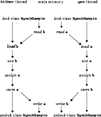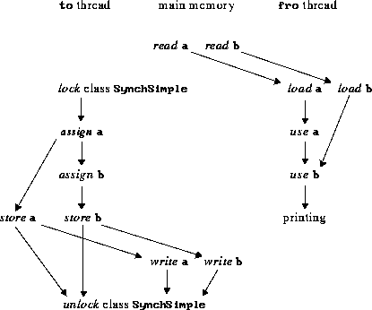 In what order may the actions by the main memory occur? Note that the rules do not require that write a occur before write b; neither do they require that read a occur before read b. Also, even though method to is synchronized, method fro is not synchronized, so there is nothing to prevent the read actions from occurring between the lock and unlock actions. (The point is that declaring one method synchronized does not of itself make that method behave as if it were atomic.)