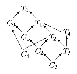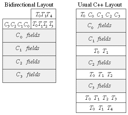 The success of these dispatch layout rules is illustrated by the layouts for the classes in the complex hierarchy of Figure 11. Even though their layouts are computed with only local knowledge of the hierarchy, all the classes except C3 require only a single dispatch vector. As shown in Figure 12, the class C3 has just two dispatch vectors in the bidirectional layout, whereas it has five in conventional layouts. The vertical center line in the dispatch vectors for the bidirectional layout represents the separation between the negative and positively-indexed methods. Contrast these header sizes with conventional C++ layouts: classes C1 through C4 have 2, 3, 5, and 2 dispatch vectors, respectively. The disparity between the schemes increases with deeper hierarchies.