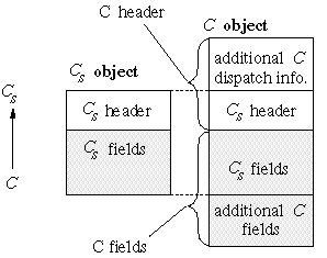 To ensure that method code inherited from the superclass need not be recompiled, the bidirectional layout makes the layout of a class compatible with that of its superclass. Compatibility is achieved by nesting the superclass layout within that of the class, as shown in Figure 3. The dotted lines connect the layout of the superclass, Cs, to the corresponding portion of the layout of the class, C. The relationship of the two classes is indicated by the vertical arrow at the left of the figure. Because C contains a portion whose layout is compatible with Cs, inherited method code will work properly when passed a pointer to the Cs portion of the object.